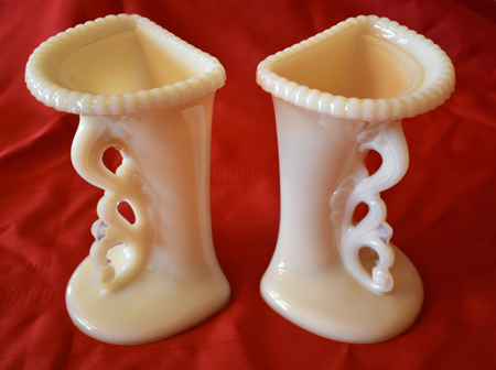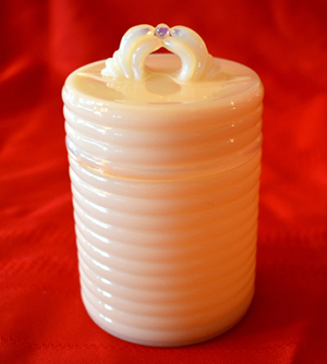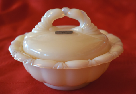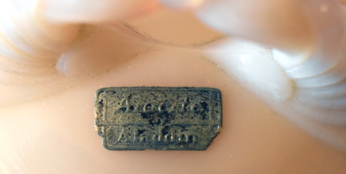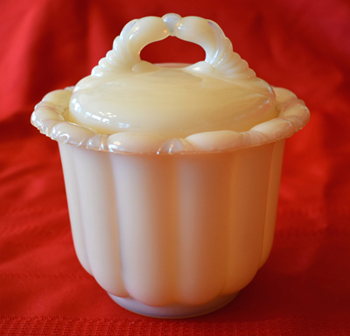 Alacite glass was the creation of Henry Hellmers and in his words was described as, "an ivory opal glass." It was described in Aladdin advertising material as, "A startlingly beautiful lamp base, and pedestal material, which resembles many of the semiprecious mineralites in texture, and has much of the softness and tone of tusk (genuine ivory)-the only color in which it is available."