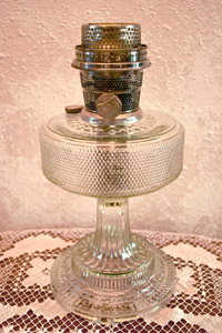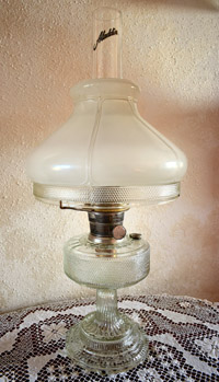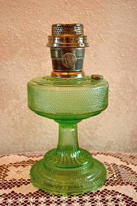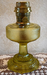 made in 1933 The Colonial Aladdin lamps have a hobnail design which runs through the glass of the oil reservoir (font). For this reason they are often referred to as "Hobnail" lamps rather than by their rightful Colonial name. The bowl and foot of these lamps were fused together when the glass was hot and this joint is the weak spot of the lamp. Temperature changes caused by such things as cleaning them in hot water, or bringing the lamp inside from the cold to a warm house, can cause the joint to crack. Care must be taken with the Aladdin Colonial lamps not to bump or stress the joint in any manor. |