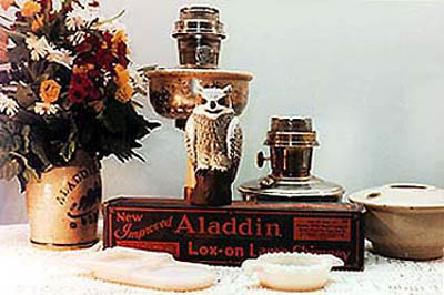 Aladdin lamps were unique in the use of a round wick to provide an even non flickering flame, and a rare earth mantle that glowed to produce the light of a 60 watt light bulb when heated by the flame from the kerosene lamp. The difference between the light of the Aladdin lamps and any other oil or kerosene lamp was so great that the company offered a one thousand dollar reward to any person who could show them an oil lamp that could equal its light. The reward was never collected, and by the early 1930's seven million Aladdins had been sold! Aladdin was also one of the pioneers in modern sales techniques and would allow customers to trade in their old oil lamps on new Aladdin lamps. They were also one of the first companies to use radio as an advertising medium in the Midwest. They paid Henry Field, who owned the Henry Field Seed Company of Shenandoah, Iowa along with a 1000 watt station KFNF, five hundred dollars to talk about their lamp on his "Evening Letterbasket" program. Included in the program was a cash offer of twenty five dollars for the best ten word slogan submitted. The response was 2200 letters and 800 of those didn't even submit a slogan--they just wanted more information on the lamp! Later radio stations to carry adds included WLS Chicago, WHO Des Moines, and WSM Nashville. As radio grew so did Aladdin's coverage until it covered the nation. Aladdin lamps were manufactured in a wide variety of styles. The first were made of metal, either brass or nickel plated brass. There were several models of the metal lamps including table lamps, bracket lamps, and some very unusual hanging lamps. The 1930's and 40's saw lamps made of colored glass, and included the now much sought after ruby crystal and cobalt blue, tall Lincoln drape Aladdin lamps. Another lamp that became the best selling lamp in Aladdin's history was the Alacite tall Lincoln drape. Alacite was a unique trademark of Aladdin and resembled ivory in its color and texture. Moonstone glass was also unique to Aladdin lamps and was so named because the glass itself seemed to glow like the pale moon. The glowing quality of moonstone is as popular with collectors today as it was with customers in the 1930's. Aladdin lamps have become very collectable today, and for anyone interested in them, the following links will give you an insight into their development, along with pictures to help you identify the many different styles. I have devoted this site to the kerosene (oil) lamps, although Aladdin also manufactured many unusual electric lamps after the advent of electricity. For anyone wishing more information you will find a link within this site to the Aladdin Knights web site which is devoted in its entirety to collectors of all types of Aladdin Lamps. I hope you enjoy this site, and that it may be of some benefit to you as an owner, or collector of Aladdin lamps. |