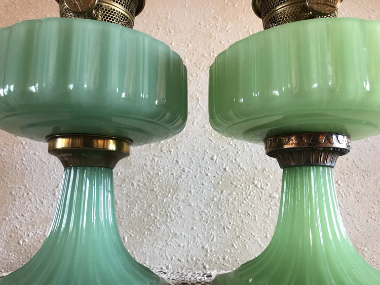 The brass connector is on the left, while the "cast" or whitmetal connector is on the right. Glue was used to fill the connectors and secure the font to the foot of the lamp. The glue is heat sensitive! If the glue is allowed to heat up it will lose it's adhesive quality and the two parts will seperate, so be very careful when handling these lamps if they have been exposed to a heat source. I have seen them seperate at auctions where they were left sitting on a hay rack in the hot sun.
