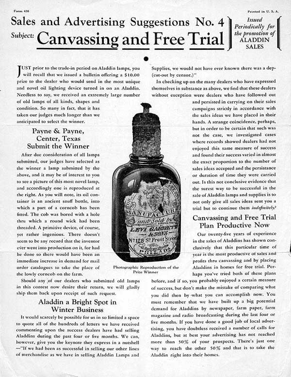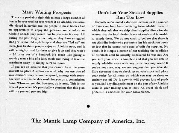 Periodic sales and advertising suggestions sent to dealers of Aladdin lamps.