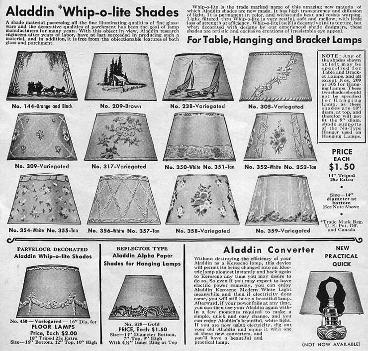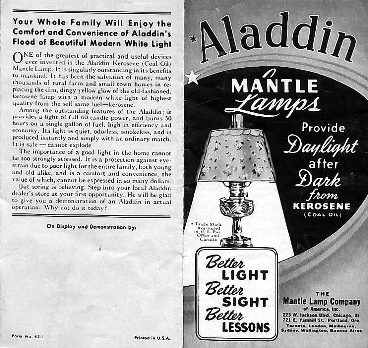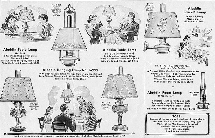 War What you see below is a fold out advertising booklet put out by Aladdin. It is form number 42-I and dates back to 1943 during World War II. At the bottom of the page you will see a "note:" from Aladdin with reference to the war and it's effect on the sale of Aladdin lamps. |
